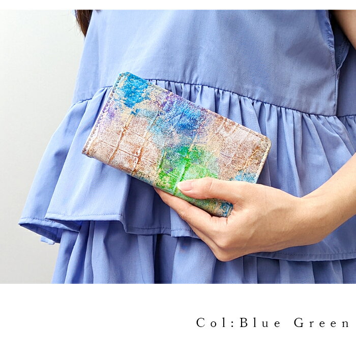 クロコダイルの型押しに顔料で色付けをしたカラフルで遊び心のある牛革を使用しております。