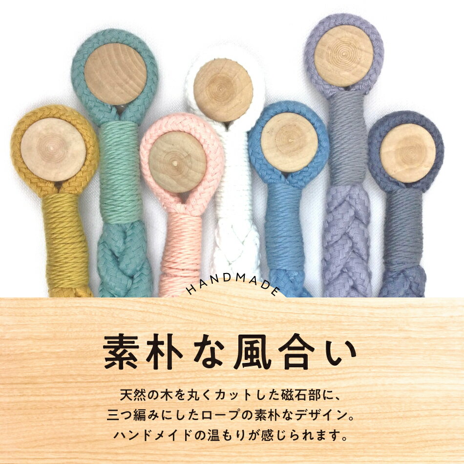天然の木を丸くカットした磁石部に、三つ編みにしたロープがついている素朴なデザインでハンドメイドの温もりが感じられます。