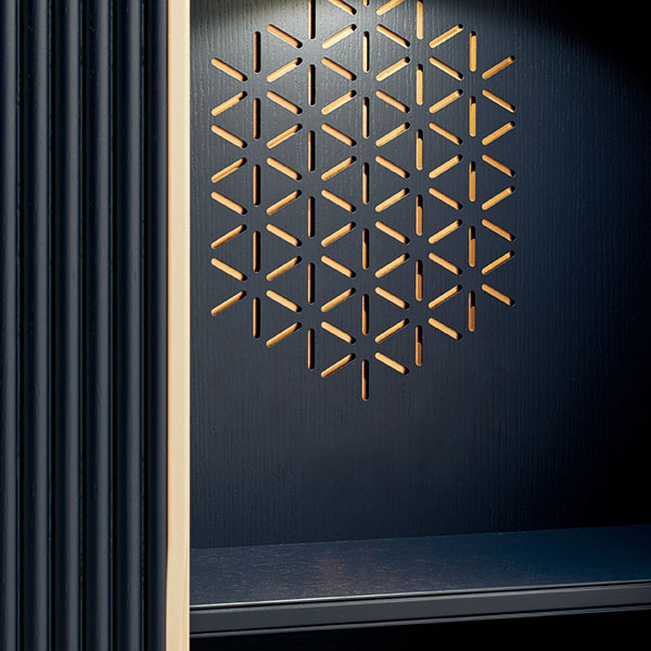 一方で須弥壇の背面にはグラフィックデザインからヒントを得た雪の結晶をイメージした透かし模様をあしらい、ご本尊を安置した時に後光のように見えるようにしています。