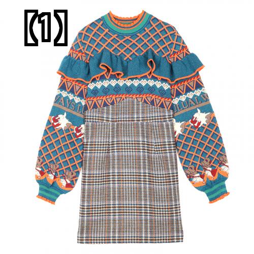 秋冬 レディース デザイン ワンピース 華やか カラフル タイトスカート ニット素材 袖 ひざ丈 ミドル丈 チェック柄